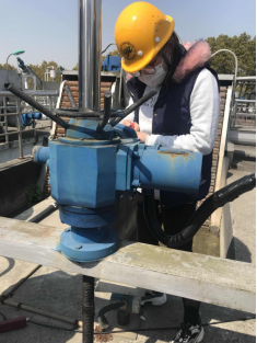 为加强动手能力,与设备亲密接触,达到理论联系实际,增加对公司各设备认知度,加深对设备的直观印象,3月21日,公司机电科韩良良带领3名第二批进厂见习的女员工陈诗薇、袁菁蓬和施赛玲,对一二期粗格栅、四联体和厌氧池上各个阀门仪表的可视窗口进行维修保养。